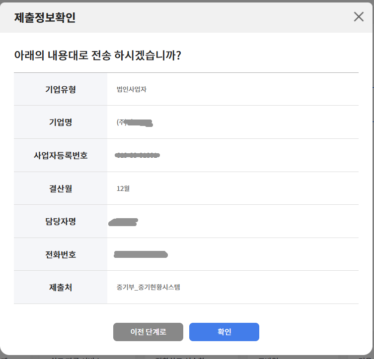제출정보확인 내용을 확인한 후 확인을 클릭하세요.