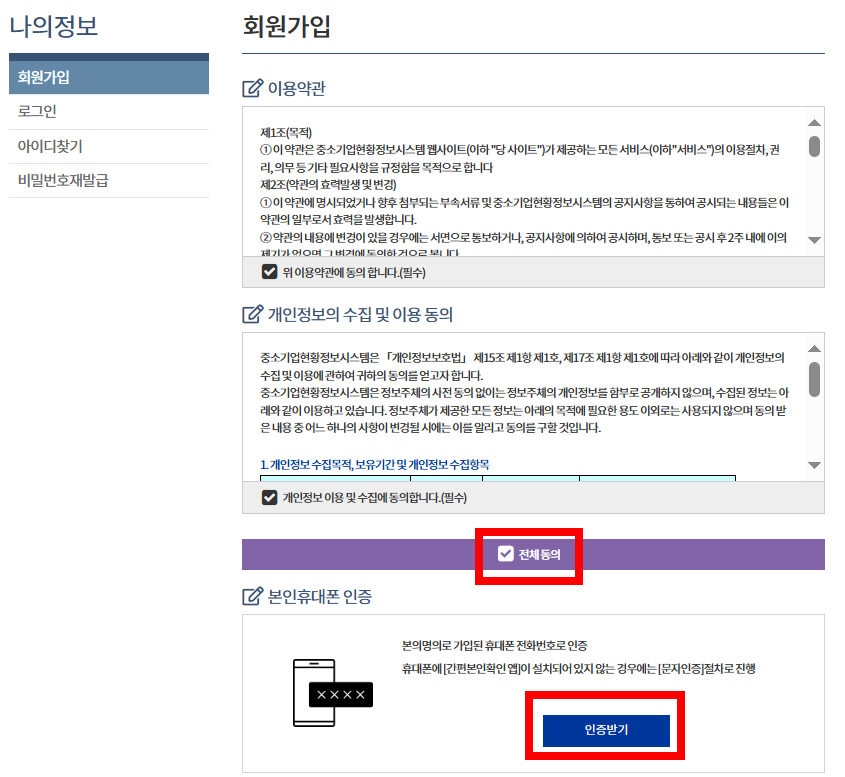 - 이용약관에 동의 후 휴대폰 인증절차를 진행합니다.