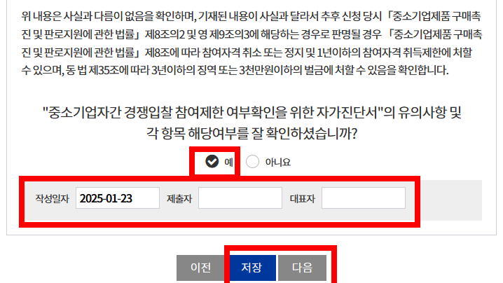 중소기업자 간 경쟁입찰 참여제한 여부확인을 위한 자가진단서"의 유의사항 및 각 항목 해당여부를 확인하신 후 "예"체크 및 작성일자, 제출자, 대표자를 입력 후 다음을 클릭합니다.