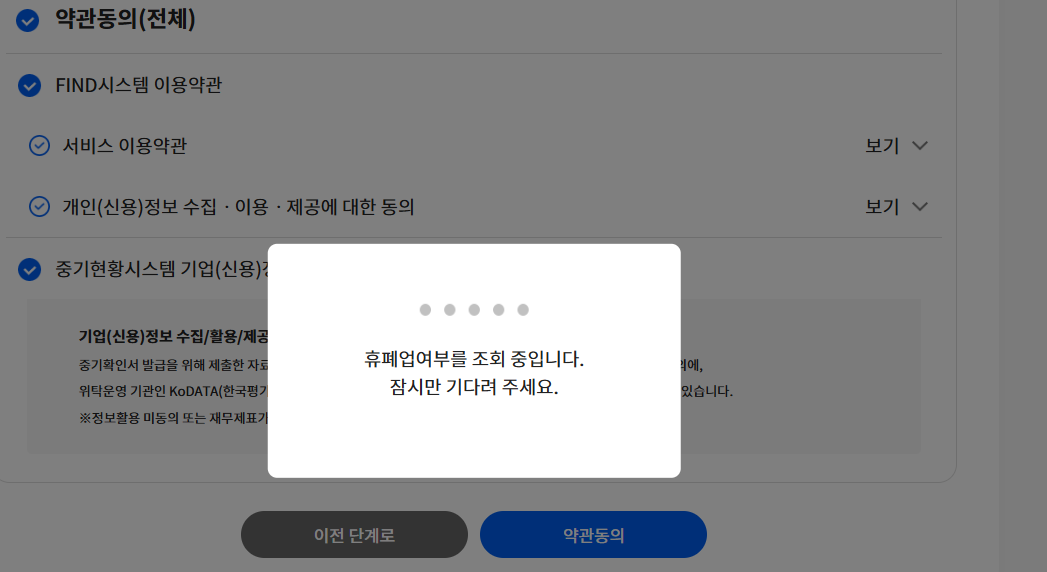 사업자등록번호, 담당자명, 휴대폰 번호를 입력하고 하단 약관동의를 클릭하면 아래와 같이 "휴폐업여부를 조회 중입니다"