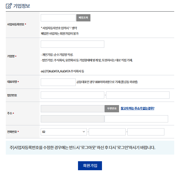 - 아이디, 비밀번호, 이용자정보, 기업정보 등 입력사항을 기재한 후 회원가입을 클릭하세요.