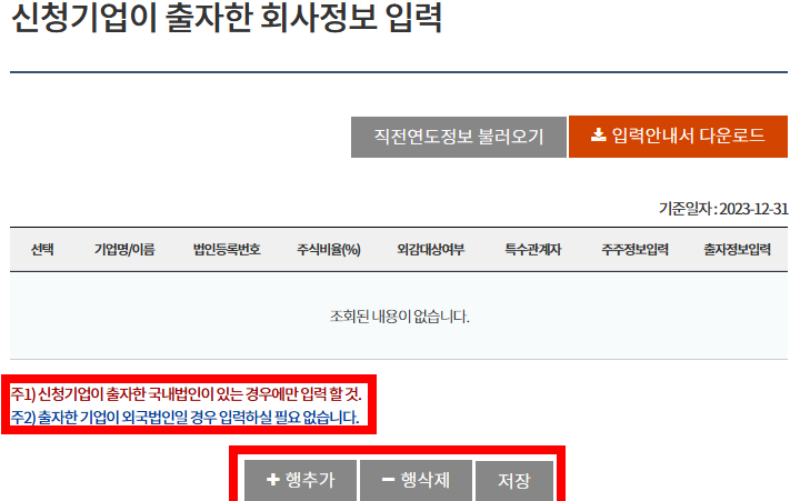 신청기업이 출자한 국내법인이 있는 경우 아래 화면에 내용을 입력하세요.