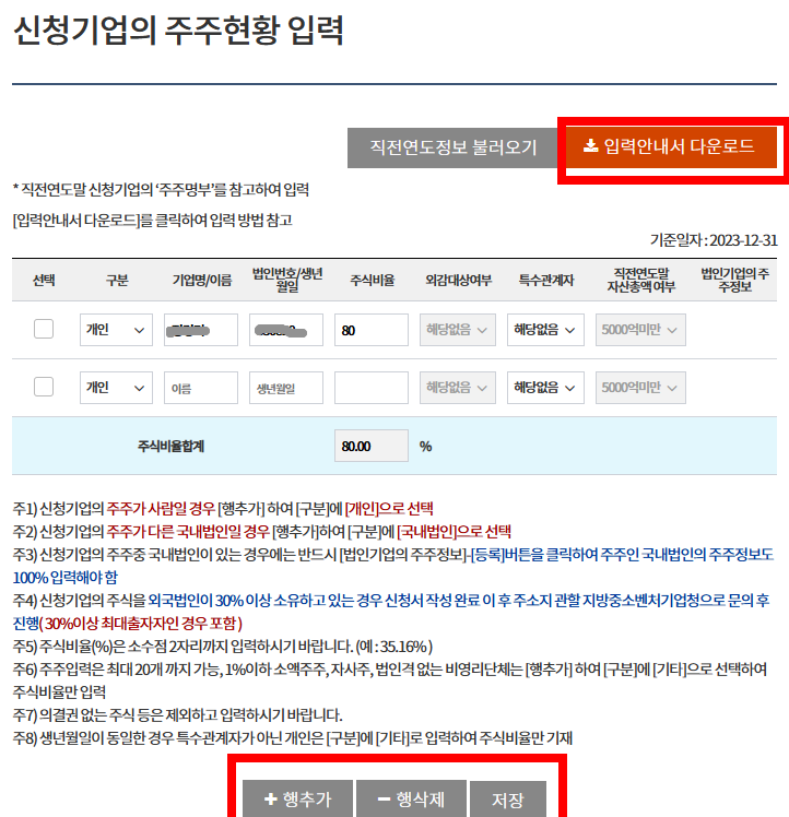 하단 행추가, 행삭제기능을 이용하여 행을 만들고 주주현황에 대해서 작성한 후 저장을 클릭한 후 하단 다음을 클릭합니다.