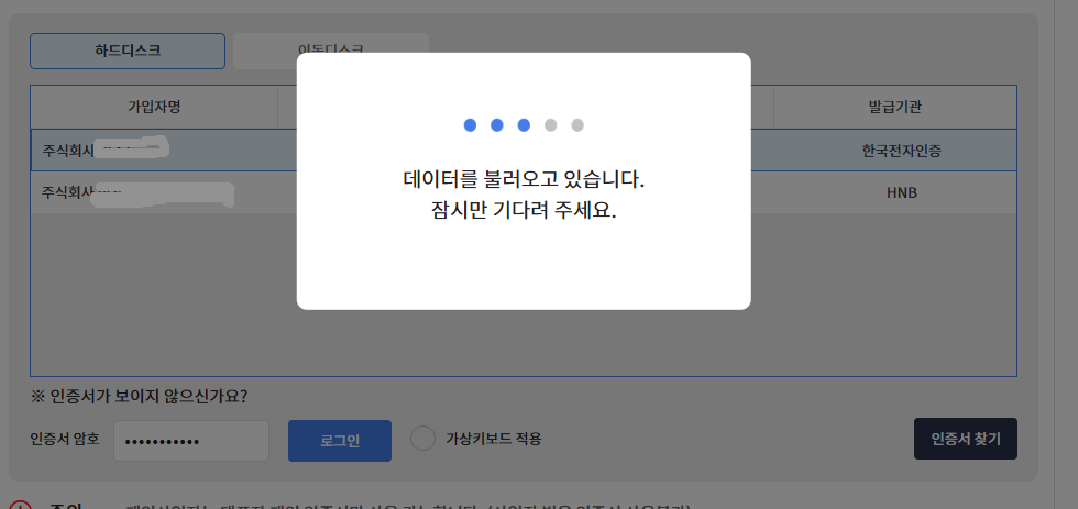 인증서 암호를 입력 후 로그인 클릭 후 잠시 기다려 주세요.