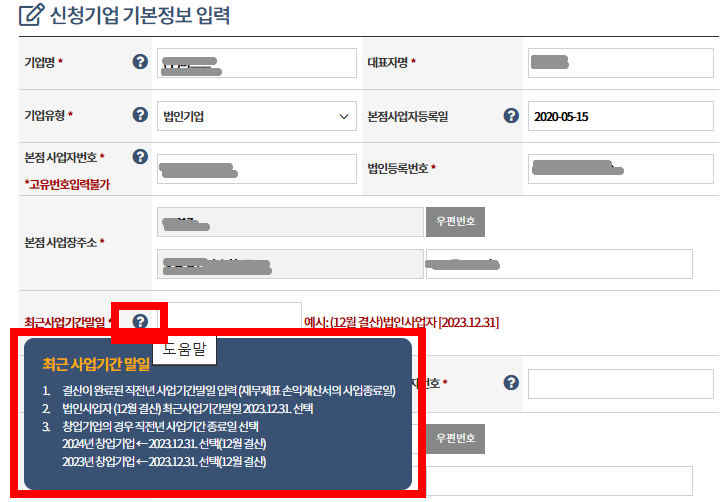 ▶ 개인기업의 최근사업기간말일 → 직전연도 말일