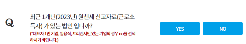 - 질문 내용 중 원천세 신고자료가 있는 법인입니까? 내역에 대표자 1인만 있는 기업은 NO를 선택하라고 안내되어있으니 원천세 신고자료는 있지만 대표자1인만 있는 1인기업의 경우 no를 선택하세요.
