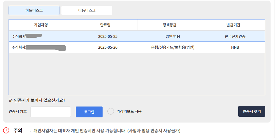 하드디스크에 저장된 인증서 중 범용인증서를 선택한 후 인증서 암호를 입력 후 로그인 하세요.