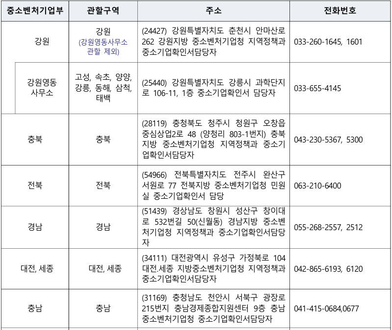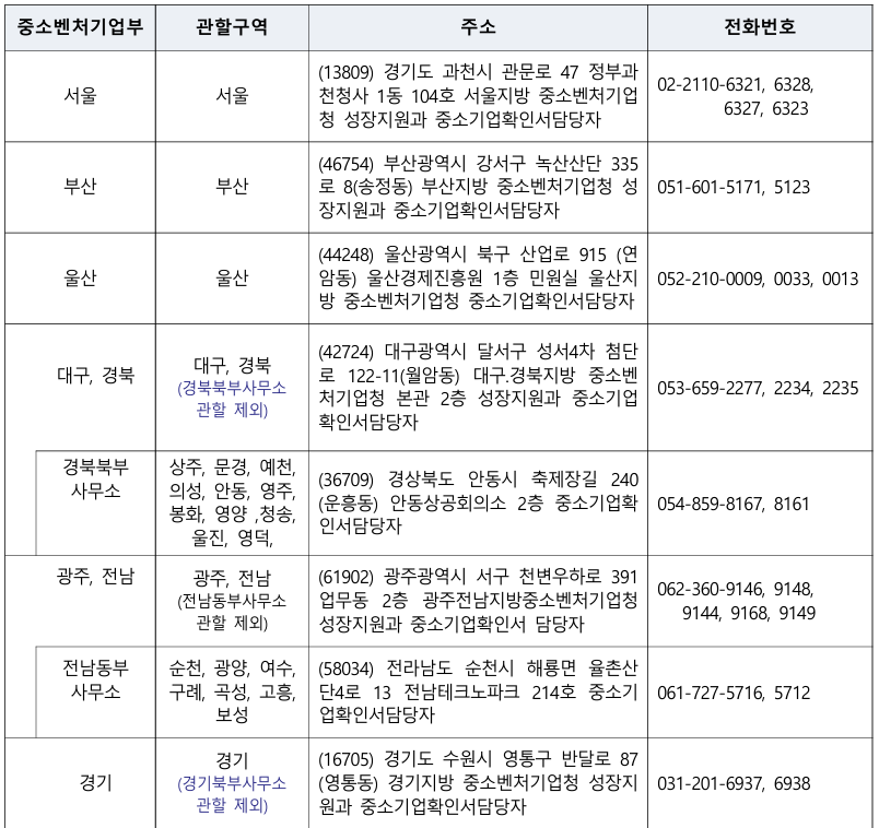 - 신청서 작성 관련 : 주소지 관할 지방중소벤처기업청 (연락처는 [홈페이지 상단]-[중소기업확인서 발급신청]-[발급안내 문의처]를 참조하시기 바랍니다.)