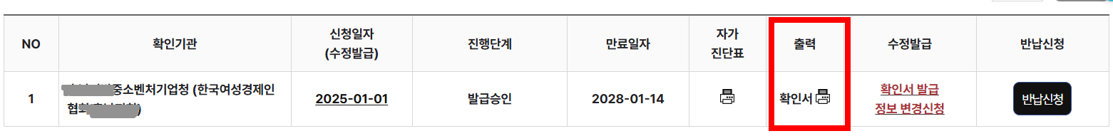 (저는 여성기업확인서를 발급받은 상태라 아래와 같이 발급완료에 표시되어 있습니다.)