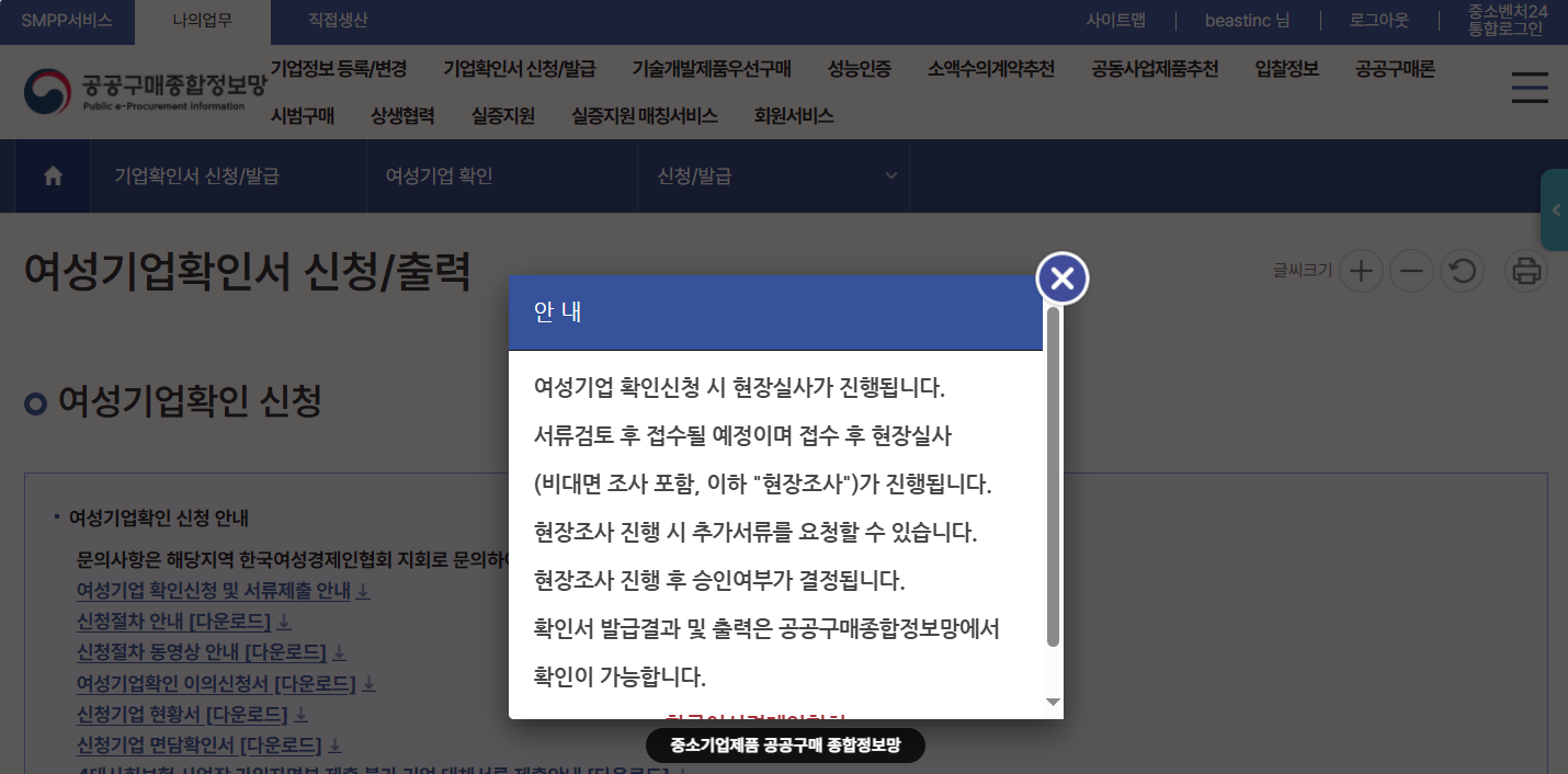 아래와 같은 "여성기업 확인신청 시 현장실사가 진행됩니다"라는 팝업이 뜨면 내용확인 후 닫으시고요