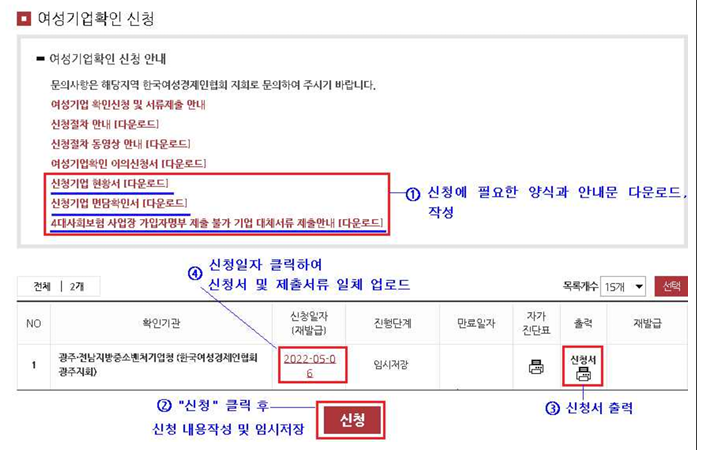 * 공통제출서류 : 여성기업확인 신청서 (임시저장 후 출력하여 업로드 요망)