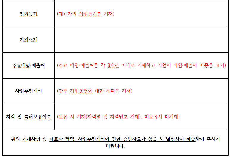 다운로드한 신청기업 현황서의 빈칸을 작성한 후 준비하시면 됩니다.