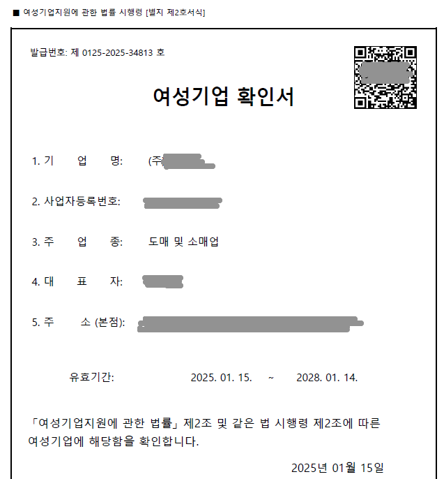 여성기업확인서의 유효기간은 3년이니 체크해 두세요.
