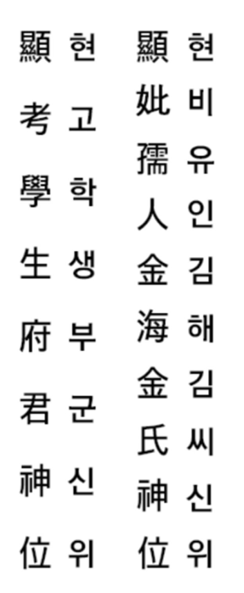 - 증조모: 顯曾祖妣孺人ㅇㅇㅇ氏神位 (현증조비유인ㅇㅇㅇ씨신위)