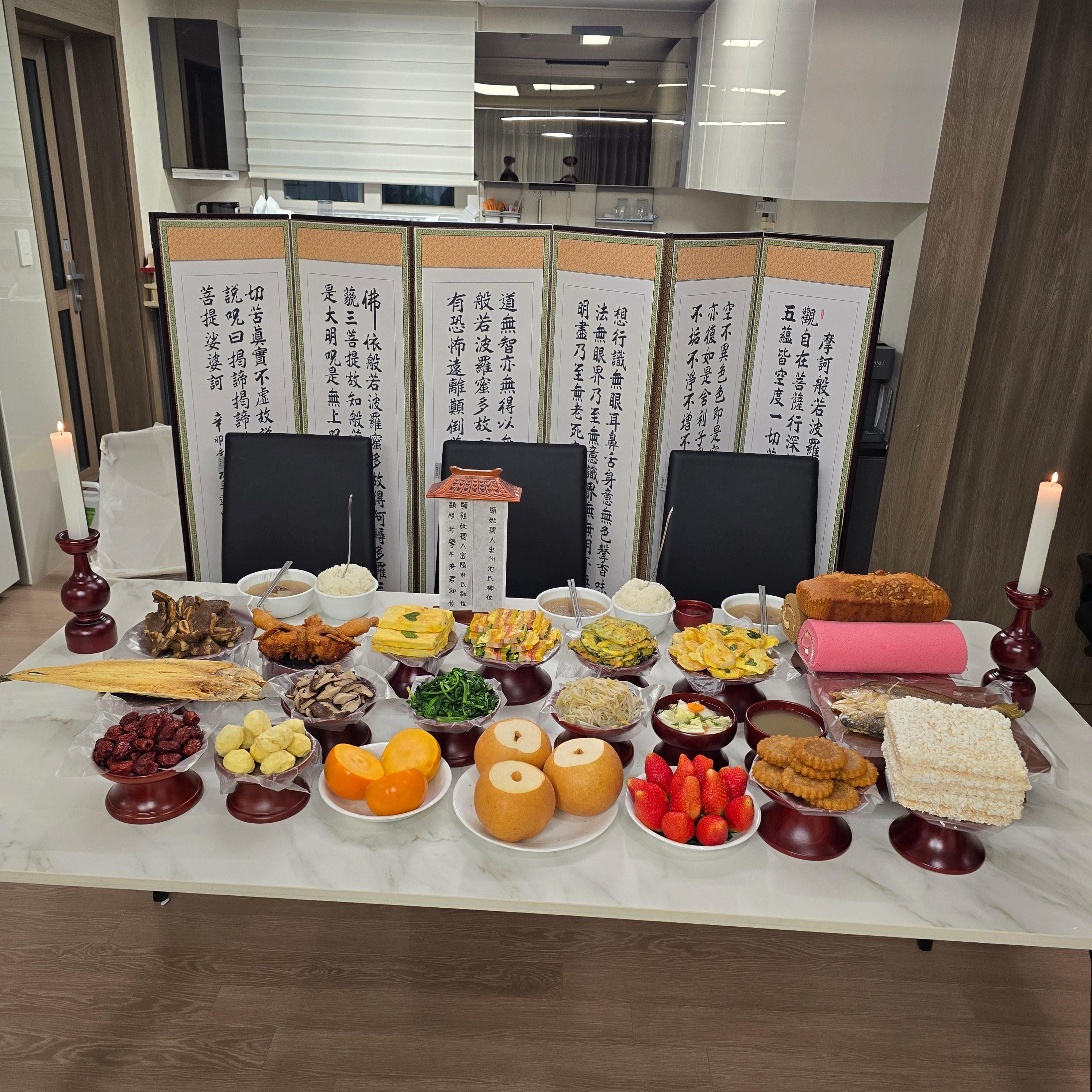 저희 집은 (물론 기제사 사진입니다.) 처음에는 간소하지만 최대한 격식에 맞추려고 왼쪽사진처럼 지낸 적도 있고 조금씩 상황에 따라 변화시키다 보니 최근에는 오른쪽처럼 지낸 적도 있습니다. 고사리, 시금치, 도라지 대신 표고버섯, 참나물, 숙주나물을, 떡 대신 빵을, 사과 대신 딸기를, 육전 대신 LA갈비와 통닭을, 좌식으로 차리던 교자상 대신 입식으로 앉아서 드시게끔 식탁을, 그때그때 상황에 따라 정성만 가득히 올리고 있습니다. 다만 꼭 지키는 차례상 메뉴는 추석에는 송편을, 설날에는 떡국을 올리고 있습니다.