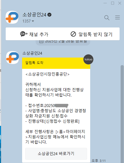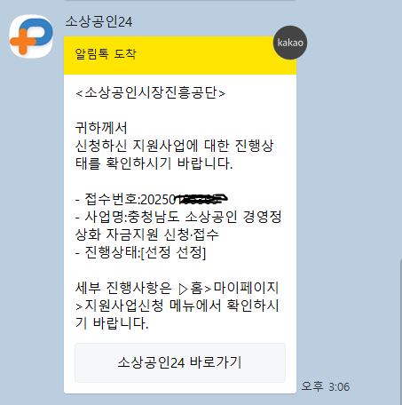 저의 경우 신청 후 7일째 되던 날 아래와 같이 선정되었다는 알림톡을 받았습니다.